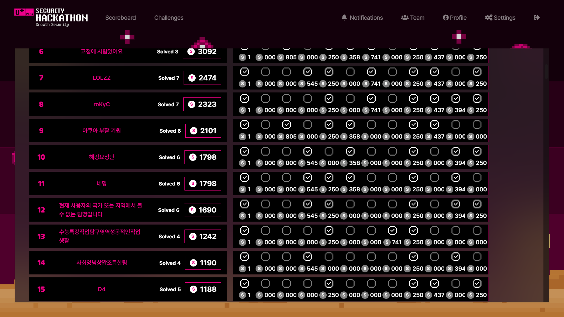 D4 라는 팀으로 이 대회에 참가했습니다. 문제는 분야별로 2~3 문제 정도가 출제되었고, 문제들이 모두 괜찮았습니다. 저희팀은 5문제, 저는 mic-check를 제외하고 2문제를 해결했고, 15등으로 본선 출전은 어렵게 됐습니다. pwnable의 Chatting Server 라는 문제를 풀지 못해 아쉬움이 있습니다.