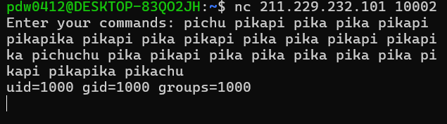 pikachu 명령어로 &a를 실행하니 &a 를 'cat flag'로 바꾸고 실행하면 될 것 같다. 100자 제한이 있으니 효율적으로 만들어야 하는데, 여기서 내가 생각해낸 방법은 2진수 였다. 'cat flag'를 16진수로 나타내면 0x67616c6620746163 이다. 이를 2진수로 바꾸고, b=2, c=1로 설정한 이후에 pikapika(a = a * b) 명령어로 a<<1 해주면서 pikapichu(a = a xor c) 명령어로 최하위 비트를 맞춰주면 된다.
