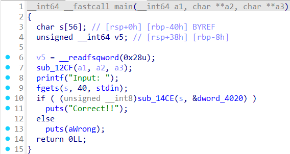 ida로 main함수를 열어보면 문자열을 입력받고, sub_14CE 함수로 입력값을 확인한 다음 정답인지 아닌지 알려주는 코드이다.