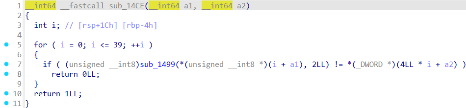 sub_1499로 입력값을 연산한 뒤, dword_4020[i*4] 와 비교해준다.